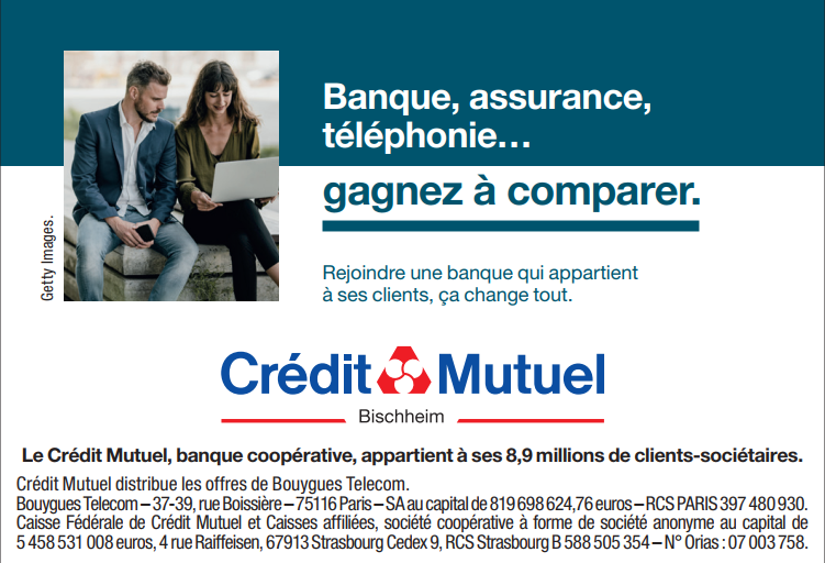 Le Crédit Mutuel Bischheim accompagne les particuliers, les professionnels et les associations locales dans tout leur projet. Son équipe de conseillers dédiés proposent des solutions en matière d’épargne, de crédit, d’assurance, de téléphonie et de télésurveillance.